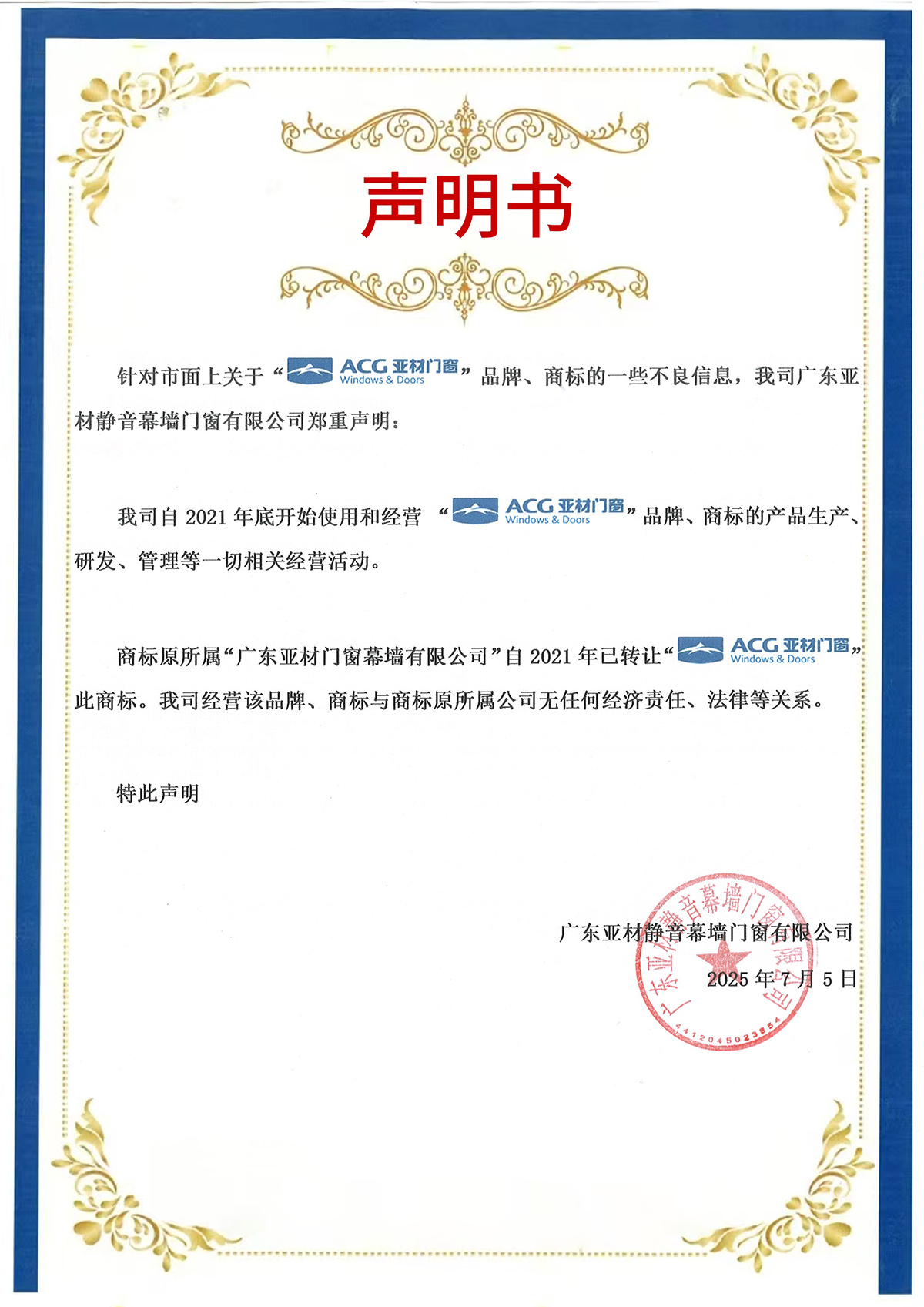 針對市面上關(guān)于“ACG亞材門窗“品牌、商標(biāo)的一些不良信息,我司廣東亞材靜音幕墻門窗有限公司鄭重聲明: